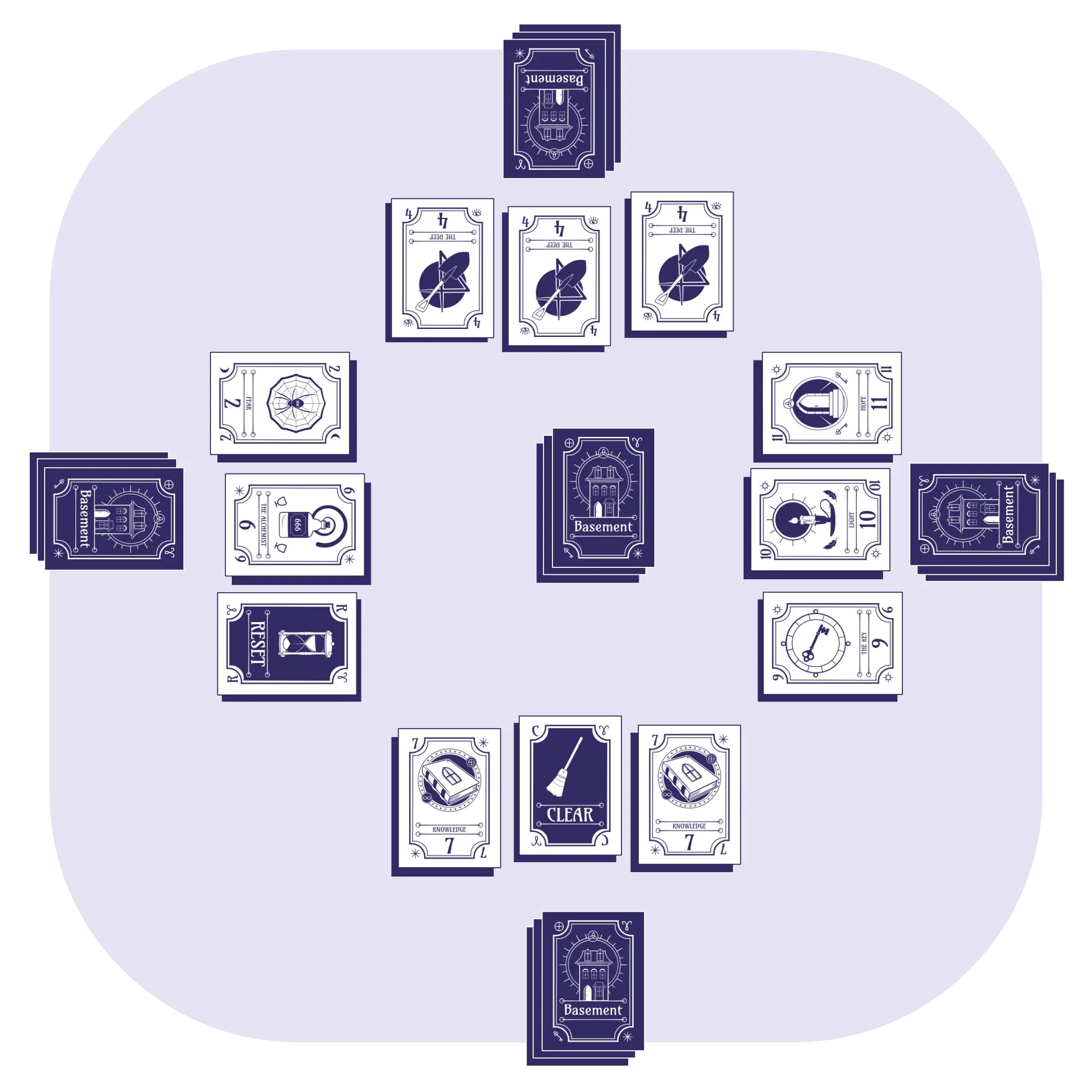 When you have played your Top Cards, you begin playing from the Basement. Basement cards are played one at a time without looking. You are in the dark. Choose wisely! The chosen card must be revealed for all players to see.